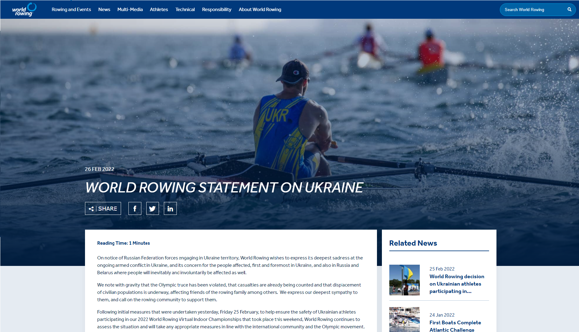 Μετά την ενημέρωση ότι οι δυνάμεις της Ρωσικής Ομοσπονδίας προελαύνουν στο έδαφος της Ουκρανίας, η World Rowing επιθυμεί να εκφράσει τη βαθύτατη θλίψη της για τη συνεχιζόμενη ένοπλη σύγκρουση στην Ουκρανία και την ανησυχία της για τους πληγέντες, πρωτίστως στην Ουκρανία, καθώς και στη Ρωσία και τη Λευκορωσία, όπου οι άνθρωποι αναπόφευκτα και ακούσια θα επηρεαστούν επίσης. Τονίζουμε με σημασία ότι η ολυμπιακή εκεχειρία έχει παραβιαστεί, ότι οι απώλειες έχουν ήδη καταμετρηθεί και ότι ο εκτοπισμός των αμάχων βρίσκεται σε εξέλιξη, επηρεάζοντας μεταξύ άλλων τους φίλους της κωπηλατικής οικογένειας. Εκφράζουμε τη βαθύτατη συμπάθειά μας σε αυτούς και καλούμε την κοινότητα κωπηλασίας να τους υποστηρίξει. Μετά τα αρχικά μέτρα που ελήφθησαν χθες, Παρασκευή 25 Φεβρουαρίου, για την ασφάλεια των Ουκρανών αθλητών που συμμετείχαν στο Εικονικό Παγκόσμιο Πρωτάθλημα Κλειστής Κωπηλασίας 2022 που πραγματοποιήθηκε αυτό το Σαββατοκύριακο, η World Rowing συνεχίζει να αξιολογεί την κατάσταση και θα λάβει τα κατάλληλα μέτρα σύμφωνα με τη διεθνή κοινότητα και το Ολυμπιακό κίνημα.